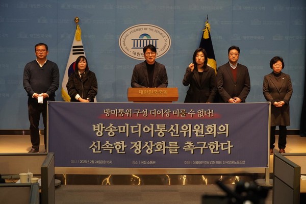 더불어민주당 김현 의원과 전국언론노동조합(위원장 이호찬, 이하 언론노조)은 24일 오후 4시 국회 소통관에서 기자회견을 열고, 지난해 9월 제정된 ‘방송미디어통신위원회(이하 방미통위) 설치법’에 따른 방미통위의 조속한 구성과 공영방송 정상화를 강력히 촉구했다.