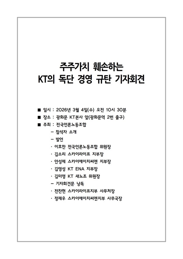 스카이라이프와 HCN의 지속 가능한 성장은 대주주 KT의 독단이 아니라 주주와 구성원의 신뢰 위에서만 가능하다. KT가 끝내 경영 정상화를 위한 실질적 개선 요구를 외면하고 깜깜이 인사를 강행한다면, 우리는 KT의 독단적이고 일방적인 인사와 경영 개입에 피해를 입고 있는 모든 이들과 연대하여 법적·사회적 책임을 끝까지 묻을 것이다. <끝>