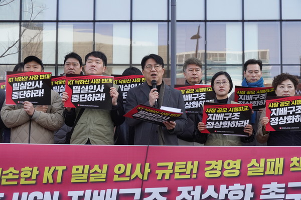 언론노조 스카이라이프지부와 스카이에이치씨엔지부는 4일 기자회견을 열고 대주주 KT에 낙하산 사장 선임을 중단하라고 촉구했습니다. KT는 자회사 스카이라이프와 손자회사 스카이HCN의 경영진 선임을 좌지우지하며 정상적 지배구조를 무너뜨려왔습니다. 언론노조 스카이라이프지부와 스카이에이치씨엔지부가 투명하고 공정한 사장 공모 절차를 마련하고 다양한 외부 전문가로 구성된 독립적 이사회를 구성해 KT 거수기 이사회를 탈피해야 한다고 강조한 이유입니다. 이날 기자회견에서 이호찬 언론노조 위원장은 “스카이라이프와 스카이HCN의 사장 선임 절차는 선임 기준도 공개하지 않고 검증 과정도 설명하지 않는 등 너무 불투명하고 무원칙하다”며 “밀실에서 선임된 낙하산 사장이 기업 경쟁력을 내리꽂고 있는 만큼 낙하산 사장 임명을 중단해야 한다”고 촉구했습니다. 이 같은 노조의 투쟁 끝에 조일 스카이라이프 사장, 원흥재 스카이HCN 사장의 퇴진을 이끌어낼 수 있었습니다.