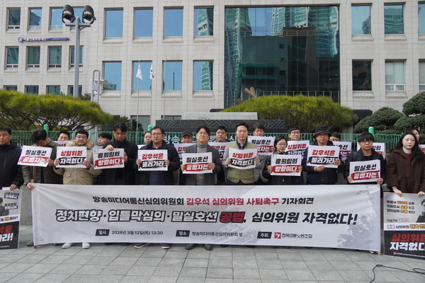 언론노조는 12일 방송회관 앞에서 김우석 방송미디어통신심의위원회 위원의 사퇴를 촉구하는 기자회견을 열었습니다. 김우석 전 방심위원은 윤석열 정권의 비판 언론을 겨냥한 ‘입틀막 심의’의 주동자이기 때문입니다. 이날 기자회견에서 이호찬 위원장은 “류희림 체제의 방심위는 정권의 방송장악을 위한 첨병”이었다며 “공정과 객관이 생명이어야 할 방심위를 표적 심의와 왜곡 심의의 장으로 몰락시켰다. 그 류희림 체제에서 심의위원을 맡으며 철저히 부역한 자가 바로 김우석 위원”이라고 꼬집었습니다. 이어 “김 위원이 심의위원으로서의 최소한의 양식이라도, 양심이라도 있다면, 그간의 과거에 대해 참회하고 사죄하고, 스스로 자리에서 물러나야 할 것”이라고 사퇴를 촉구했습니다.