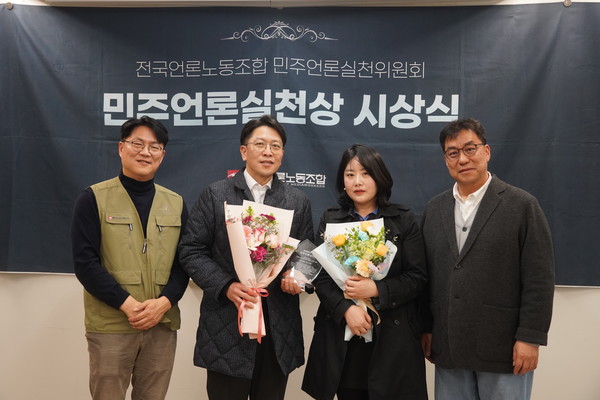 3월 17일 언론노조 회의실에서 2월 민주언론실천상 시상식이 열렸습니다. 민주언론실천위원회는 2월 민주언론실천상 수상작으로 SBS 뉴스토리 <경찰의 자격: 남녀 통합 선발이 던지는 질문>(류란 SBS 기자, 김태훈 SBS A&T 영상취재기자, 이은경·박혜린 작가)을 선정했습니다. 심사를 맡은 민실위원들은 SBS의 보도가 여경 혐오 논란, 남성 역차별 논란 같은 소모적 논쟁에 파묻히지 않고 시청자에게 새로운 시각을 제시했으며, 논란을 감수하고 어려운 주제를 정면으로 마주했다고 평가하며 수상작으로 선정했습니다. 수상자분들에게 축하의 박수를 보냅니다! 더 많은 민주언론실천상 수상작은 이곳에서 확인하실 수 있습니다!