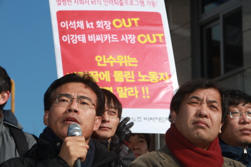 6일 수요일 오전 11시 서울 삼청동 대통령직 인수위원회 (금융연수원) 앞에서 '비씨카드·스카이 라이프 민주노조 사수 공동대책위원회'가 차기 정부에 KT 이석채 회장 및 KT 내 낙하산 인사 척결을 촉구했다.