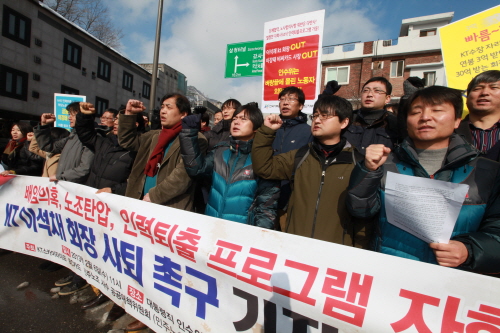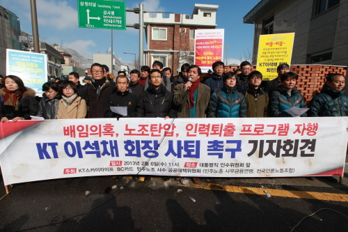 박조수 사무금융노조 위원장은 "KT는 이석채 회장이 부임한 이후 반노조, 반인권적인 회사로 이름을 떨치고 있다"며 "박근혜 당선자가 신뢰있는 정권으로, 상식이 통하는 정권을 만들겠다면 직원들을 돈벌이 수단과 사찰대상으로 보는 이석채 회장을 사퇴시켜야 한다"고 밝혔다.