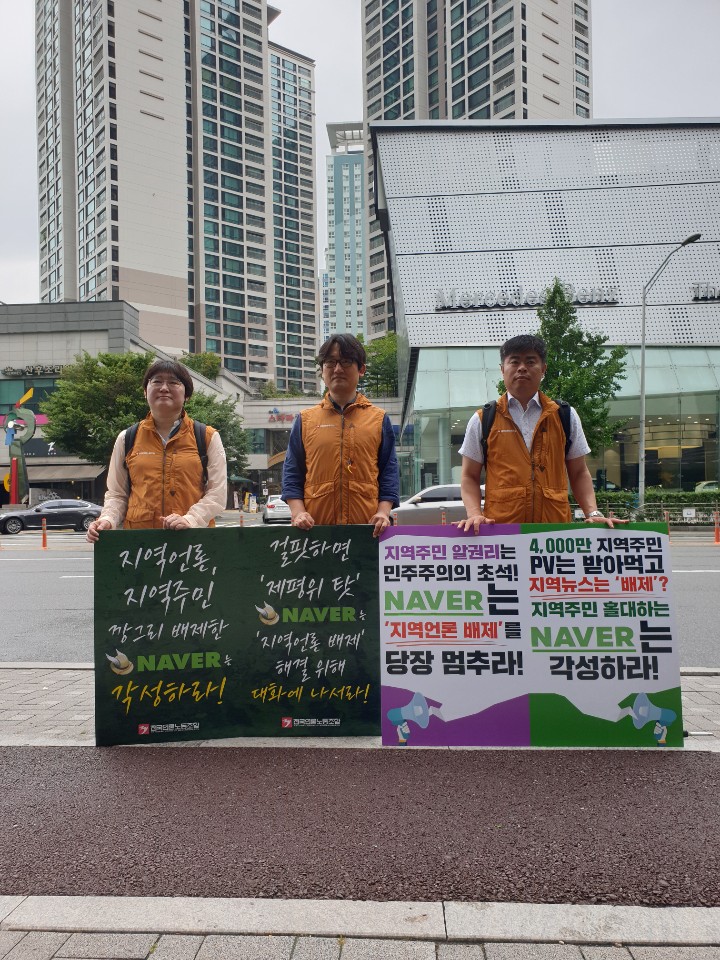전국언론노동조합(위원장 오정훈·이하 언론노조)은 12일 오전 11시 30분 경기도 성남시 네이버 본사(그린팩토리) 앞에서 언론노조 송현준 수석부위원장, 김지원 경남일보지부장, 박은종 OBS지부장이 참석한 가운데 1인 시위를 이어갔다.