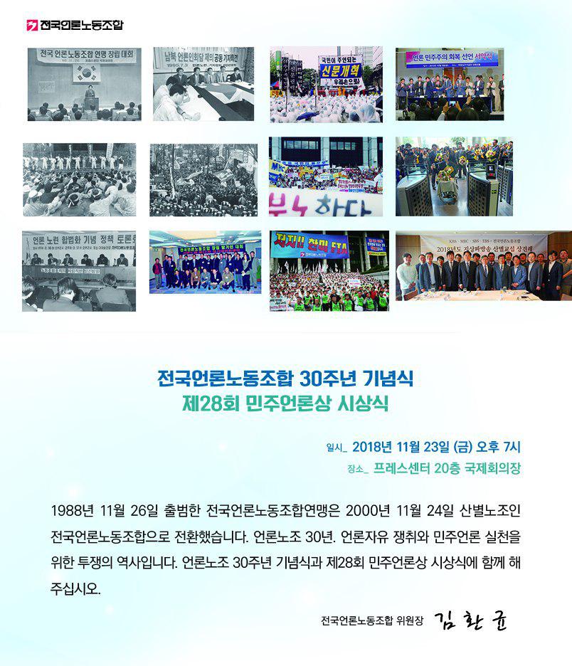 2018년 11월23일(금) 오후 7시 서울 중구 태평로 프레스센터 20층 국제회의장에서 언론노조 30주년 기념식과 제 28회 민주언론상 시상식을 합니다. 본부 지부 분회 깃발 입장식이 있습니다. 깃발 지참 바랍니다. 많은 참석 부탁드립니다.