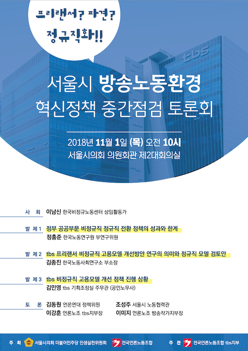 4. 하지만 방송사 비정규 노동에 대한 제대로된 인식과 공감대 부족이라는 한계 때문에 실제 추진 과정에서 어려가지 어려운 점들이 많이 있습니다. 현재까지의 정책 진행 상황을 살펴보고 해결책을 모색하는 토론회를 11월 1일 목요일 오전 10시 서울시의회 의원회관 제2대회의실에서 정흥준 한국노동연구원 부연구위원, 김종진 한국노동사회연구소 부소장, 김민영 tbs 기획조정실 주무관의 발제와 함께 개최합니다.