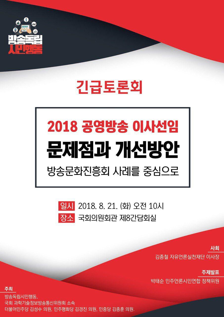 4. 방송독립시민행동과 국회 과학기술정보방송통신위원회 소속 더불어민주당 김성수 의원, 민주평화당 김경진 의원, 민중당 김종훈 의원 공동주최로 국회, 시민단체와 공영방송 구성원들이 바라보는 이번 방문진 이사선임의 문제점과 개선방안에 대한 공개적인 토론을 통해 공영방송 이사의 정치적 독립을 강조하고 토론해보고자 합니다.