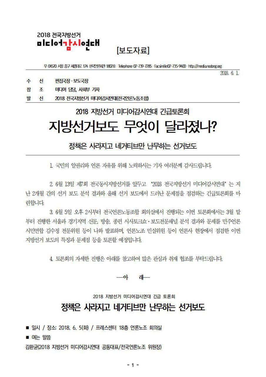 2018 지방선거 미디어감시연대 긴급토론회 지방선거보도 무엇이 달라졌나? 정책은 사라지고 네거티브만 난무하는 선거보도 |