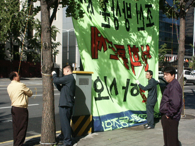 조선 기자는 민원해결사인가스포츠조선 관련 중구청에 "조선 겨냥한 현수막 떼라" 전화"제발 사정 좀 봐주세요. 우리들도 죽을 맛입니다."요즘 서울 중구 프레스센터 앞은 아침마다 전국언론노조와 중구청 직원들 사이의 실랑이가 벌어져 때아닌 진풍경을 이루고 있다. 중구청측이 스포츠조선 사태와 관련해 언론노조가 거리에 내 건 대형 현수막을 불법 부착물로 간주, 이의 철거를 요구하고 나섰기 때문이다.중구청측은 프레스센터 앞에서 철야농성이 시작된 지난 13일부터 하루 두 차례로 꼴로 농성장을 찾아 현수막의 철거를 요청하고 있고, 이에 언론노조는 현수막을 거둬들였다가 다시 내거는 '편법'을 동원하고 있다. 하지만 언론노조가 현수막을 내걸면 어김없이 중구청 직원들은 다시 농성장을 찾아온다.사정이 이렇다 보니 언론노조와 중구청 직원 사이에는 잦은 언쟁이 벌어지기 일쑤다. 중구청은 "불법이니 현수막을 철거하라"는 말이 고정 레퍼토리이고, 언론노조는 "정당하게 집회를 하고 있는 장소에 내 건 현수막을 철거하겠다는 것이 말이 되느냐. 공연한 일에 핏대를 세우지 말고 방씨 일가가 소유한 코리아나호텔 앞의 고질적인 불법 주·정차부터 신경을 쓰라"는 것이 반박의 요지다.그러던 가운데 중구청의 한 직원은 "우리도 이러고 싶지 않다"며 자신들의 속사정을 털어놓기 시작했다. 조선일보측이 김동일 중구청장은 물론 관련 부서에 여러 차례 전화를 걸어 "불법 현수막을 단속하라"고 압력을 행사하고 있다는 것이다. 이러한 전화는 중구청 입장에서는 껄끄러울 수밖에 없는 조선일보 서울 시청 출입기자실에서도 걸려오고 있다는 게 이들의 설명이다.중구청 자치행정과 한 관계자는 "조선일보 시청 출입기자인 K모, S모 기자는 시시때때로 전화를 걸어 '왜 불법 현수막을 철거하지 않느냐'고 따져 묻는다"며 "조선일보가 집요하게 전화를 걸어오는 통에 높은 분들도 꽤 신경을 쓰는 눈치여서 우리도 곤욕스럽기는 마찬가지"라고 말했다. 이 관계자는 '조선일보의 민원'이라는 단어까지 사용했다가 나중에는 "우리가 현수막 철거에 나선 것은 조선일보가 무서워서라기보다 우리 할 일을 하는 것일 뿐"이라며 자신의 발언을 수습하려 애쓰기도 했다.이와 관련해 조선일보 K모 기자는 "현수막에 쓰여진 내용이 사실이 아니기에 조선일보의 일원을 떠나 민원을 제기한 것일 뿐"이라며 "이는 내 집 앞에 쓰레기가 쌓이면 이를 치워달라고 전화를 하는 것과 같은 사안"이라고 설명했다.이영식 전국언론노조 스포츠조선지부 위원장은 "조선일보 기자들이 '관계사' 관계인 스포츠조선 사태의 해결을 위해 나서 줄 것으로 기대하지는 않았지만 최소한 객관자적인 입장만은 견지해 주었으면 한다"며 "개인 자격이라고 하지만 이처럼 기자들이 구청에 전화를 하는 행위는 어느 의미로 보나 '압력'에 다름 아닐뿐더러 충분히 기자가 사주와 회사의 민원 해결사로 나서고 있다는 오해를 불러일으킬 수 있다"고 씁쓸해 했다.