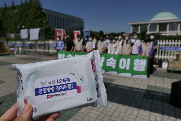 전국언론노동조합 KBS본부와 MBC본부를 비롯해 아리랑국제방송지부, iMBC지부, TBS지부, 국민일보지부, 뉴시스지부, KBS미디어텍지부, 경인일보지부, 경향신문지부, CBS지부가 국회 앞에 모였다. 이들은 ‘정기국회 1호숙제, 공영방송 정치독립' 스티커가 붙은 물티슈를 국회 앞에서 500여명의 시민들에게 나눠줬다.