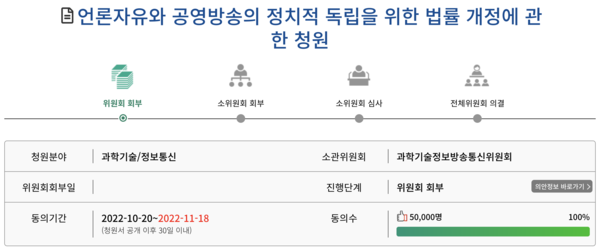 이번 국민동의청원 성사는 몰상식과 천박함의 언론관을 가진 윤석열 정부에 대한 경고이자 법안 상정을 미루며 눈치만 보던 민주당에 대한 채찍이다. 방송법 제정 이후 처음으로 시민과 노동자의 힘만으로 공영방송의 정치적 독립을 위한 법률 개정안건이 상임위에 상정된다.
