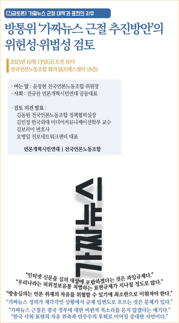 4. 이에 언론개혁시민연대와 전국언론노동조합은 언론법 및 인터넷 법제, 정보인권 전문가를 모시고, 방통위 ‘가짜뉴스 근절 추진방안’의 위헌, 위법성을 검토하고, ‘허위조작정보’에 대한 올바른 대응방안을 살펴보고자 합니다. 기자 여러분의 많은 관심과 취재를 부탁드립니다. (끝)