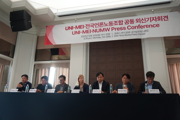 전국언론노동조합(언론노조)과 UNI-MEI(국제사무직노조연맹 미디어엔터테인먼트 분과)는 30일 오후 2시 30분 한국프레스센터 20층 내셔널프레스클럽에서 공동 기자회견을 열고 “우리는 언론을 통제하기 위해 브레이크 없는 기차처럼 달리고 있는 한국 정부를 강력히 규탄한다”고 비판했다.