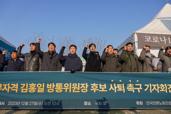 전국언론노동조합(언론노조)은 김홍일 방송통신위원장 후보자의 인사청문회가 진행된 27일 오전 10시 국회 앞에서 기자회견을 열고 김홍일 후보자의 사퇴를 촉구했다.