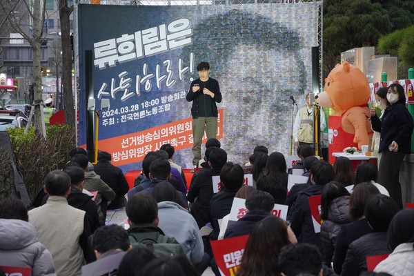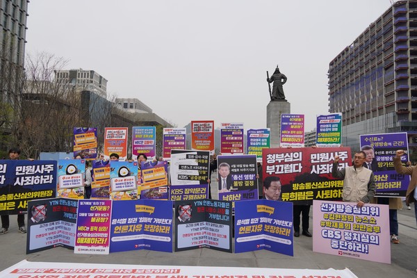 ■ 3월 28일, 언론노조를 비롯한 언론, 시민, 사회, 노동단체가 결합한 언론장악저지공동행동은 ‘대통령 심기 경호 위원회'로 전락한 선거방송심의위원회를 규탄하는 기자회견을 진행했습니다. 22대 총선 선방심위는 선거와 무관한 정권 비판 보도까지 심의하고 중징계를 내리며 편파, 표적, 정치심의를 일삼는다는 비판을 받은 바 있습니다. 이날 공동행동은 기자회견에서 “선방심의위의 법정 제재(3월 22일 기준) 15건 중 10건이 윤석열 대통령·김건희 여사·류희림 방통심의위 위원장 등 선거와는 무관한 사안”이라며 “선거와는 관계없더라도 정부·여당에 불리하다고 여겨지면 선방심의위에서 불공정한 정치적 칼날을 들이대고 있다”고 규탄했습니다. 한편 이날 언론노조 방심위지부는 저녁 6시부터 류희림 방심위원장의 사퇴를 촉구하는 결의대회를 진행했습니다. 참석자들은 류희림 방심위원장에게 편파적인 선방심위를 구성하고 취임 이래 가족과 지인을 동원한 청부심의, 정치심의를 이어오며 방심위를 망친 것에 대해 책임지고 물러나라고 입을 모았습니다. 언론노조는 양심적인 방심위 노동자들의 편에서 끝까지 함께하겠습니다.