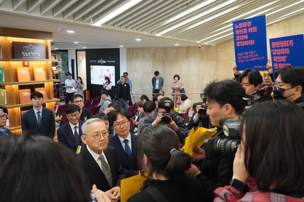■ 언론노조 출판노조협의회는 4월 23일 세종 라운지에서 진행된 문화체육관광부 주관 ‘세계 책의날' 행사에서 피켓 선전전을 진행했습니다. 출판노동자들은 잦은 임금 체불, 최저임금 위반, 연차휴가 법령 미준수, 포괄임금제 오남용 등 열악한 노동환경에 처해있기 때문입니다. 이날 행사장에서 안명희 언론노조 출판노조협의회 의장은 “출판노동자들의 열악한 노동환경 문제를 해결하기 위해 노조는 노사정이 만나 대화하자고 요구했으나 유인촌 문체부 장관은 ‘노사가 먼저 합의해오라'고 말한 뒤 출판노조를 만나주지 않는 상황"이라 지적하고, “장관님이 출판단체를 만난 것처럼 노조를 만나 현장의 이야기를 들으셨으면 좋겠다"고 말했습니다. 안 의장과 대화를 나눈 유인촌 장관은 “알았다. 만나서 얘기하면 된다"고 했고, 문체부 출판인쇄독서진흥과장은 오는 5월 언론노조 회의실에서 출판노조협의회와의 면담을 약속했습니다. 수많은 취재진과 출판노동자 앞에서 한 약속인 만큼, 문화체육관광부가 출판노동자들의 노동 환경을 바꾸기 위한 면담에 적극 나서주길 바랍니다.