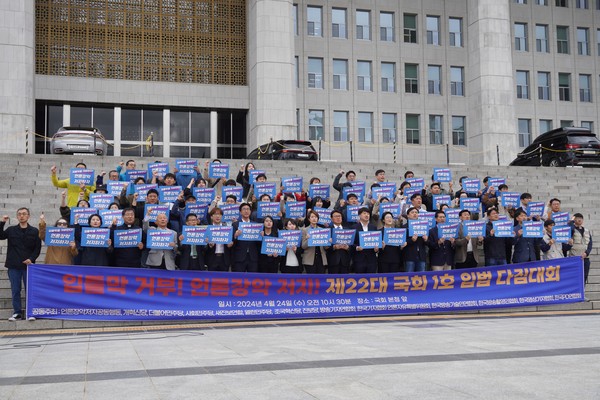 ■ 24일, 언론장악저지공동행동과 언론현업단체, 제 정당이 모여 언론장악 저지를 위한 22대 국회 1호 입법 다짐대회를 개최했습니다. 이날 참석자들은 “제22대 국회 개원 즉시 대통령 거부권으로 무산된 공영방송의 정치적 독립을 위한 방송3법 재입법, 윤석열 정권이 자행한 위법적 방송장악 및 언론탄압 진상을 규명할 국정조사, 국민의 알 권리와 언론 표현의 자유를 제도적으로 보장할 방안을 마련할 국회 미디어개혁특별위원회 설치를 최우선 과제로 삼고, 공동의 노력으로 관철해 나갈 것”이라고 힘있게 밝혔습니다.