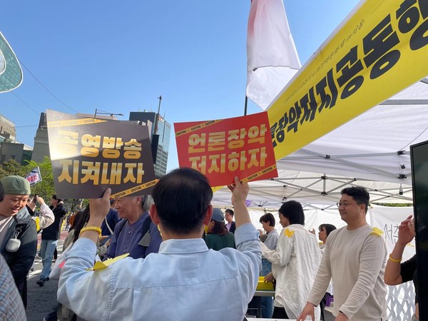 ■ 4월 8일 언론노조 KBS본부, MBC본부, YTN지부, CBS지부, TBS지부, EBS지부, 방송통신심의위원회지부는 정권의 ‘입틀막' 언론장악 행보를 규탄하며 광화문 거리로 나와 행진했습니다. 윤석열 정권의 전방위적 언론장악 실태를 시민들에게 알리 위해서입니다. 지난 3월 31일엔 우파 인사를 통해 KBS를 장악하고 언론노조 KBS본부를 무력화하는 구상을 담은 ‘KBS 장악 문건'의 존재가 언론보도를 통해 알려졌습니다. 방통위는 면밀한 심사도 없이 YTN을 유진그룹에 매각했고, 그 이후 과거 YTN 해직 사태 주범인 언론장악 부역자 김백이 YTN 사장으로 취임했습니다. 22대 총선 선거방송심의위는 정권 비판적 보도를 한 MBC와 CBS에 역대급 수위의 징계를 퍼붓기도 했습니다. 말 그대로 온 언론사가 정권의 ‘입틀막' 언론장악에 시달리고 있습니다. 이날 언론노조는 기자회견문을 통해 “입틀막의 광풍 속에 유권자와 언론이 묻고 요구할 권리는 철저히 묵살됐다”며 “언론의 자유 말살을 넘어 시민의 대통령 풍자 영상까지 수사하는 정권, 정당한 비판을 '가짜뉴스'라 주장하며 입틀막을 장담하고 있는 정당과 정치인들에 대해 엄중한 경고를 해주시길 간곡히 부탁드린다”고 시민들에게 호소했습니다.