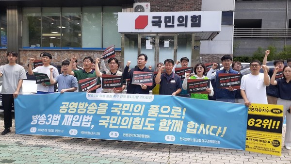 ■ 7월 1일, 전국언론노동조합이 소속돼 있는 언론장악저지공동행동에서 전국 국민의힘 당사를 찾아 ‘방송3법 입법 동참 촉구 전국 동시다발 기자회견’을 열었습니다. 이날 기자회견은 국민의힘 대구시당, 부산시당, 충남도당, 충북도당, 강원도당에서 진행됐습니다. 대구시당 앞 기자회견에 참석한 윤창현 언론노조 위원장은 “여당은 방송3법 개정안이 언론노조 장악법이라고 허위 선동을 하고 있지만 현재의 방송법이 집권 여당의 언론장악법인 것”이라며 “국민의 발언을 막고 이견을 용납하지 않는 행태가 윤석열 정권의 추락을 만든 만큼 여당도 방송3법 개정에 동참해 언론자유를 보장해야 한다”고 촉구했습니다. 언론장악저지공동행동은 기자회견 종료 후 5개 지역 국민의힘 시·도당사 측에 기자회견문을 전달했습니다.
