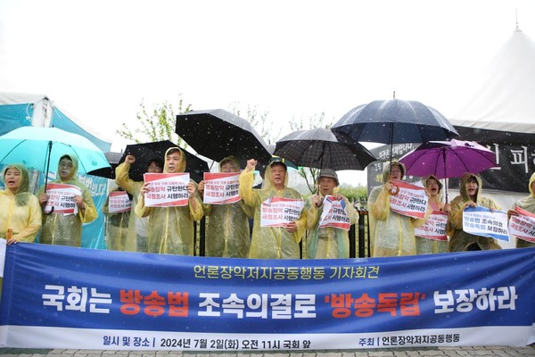 ■ 언론장악저지공동행동은 7월 2일, 방송법 의결 촉구 기자회견을 열었습니다. 이날 기자회견에서 윤창현 언론노조 위원장은 “윤석열 정권은 KBS를 장악해 명품백을 조그마한 파우치라고 말했지만 돌아온 것은 국민의 심판”이라고 꼬집으며 “이 정부의 행태는 왜 방송법을 뜯어고쳐야 하는지 스스로 증명하고 있다. 언론자유를 지키려는 언론인과 시민을 더 이상 거리의 투사로 만들지 말라”고 외쳤습니다. 언론장악저지공동행동은 기자회견문을 통해 “정권이 교체될 때마다 공영방송 이사회에 낙하산이 투하돼 방송의 독립성과 자율성을 침해 하는 퇴보의 역사를 이젠 끝내야 한다”며 공영방송의 정치적 독립을 보장하기 위한 방송 3법을 조속히 본회의에서 통과시키기를 국회에 촉구했습니다.
