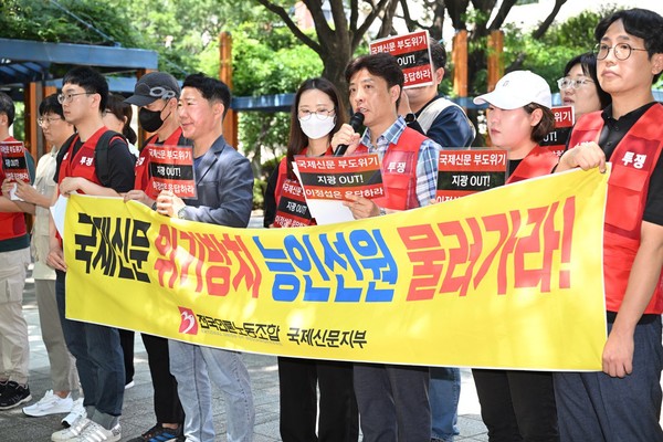 ■ 7월 4일, 언론노조 국제신문지부가 국제신문 대주주인 능인선원 측 인사를 사기 혐의로 고발했습니다. 지난 5월 14일, 능인선원과 국제신문 노사가 △ 능인선원 측이 경영정상화까지 임금 포함 제반 비용 부족분 지원 △ 비조합원 임금은 능인선원 측과 협의해 일정 조율 후 반드시 지급 등의 내용이 담긴 ‘국제신문 정상화 방안' 협약에 서면 합의한 바 있습니다. 그럼에도 능인선원 측은 자구안이 부족하다는 이유로 협약 이행을 방기하고 있습니다. 국제신문지부는 이날 오전 10시 30분, 부산경찰청 앞에서 능인선원 고발 기자회견을 열고 국제신문 조속 매각과 임금 등의 책임 지급을 촉구했습니다. 기자회견에서 전대식 언론노조 수석부위원장은 “국제신문 동지들은 국제신문이 무너지지 않도록 10년을 버텨왔는데 그 대가가 체불임금"이라고 지적했습니다. 김승주 언론노조 국제신문지부장은 “임금 체불을 해결하라는 요청에 ‘요새 임금 한 달 밀리는 건 일도 아니다’는 궤변을 늘어놓는, 저 파렴치하고 몰상식한 자들과 더 이상 대화를 할 수 없다”며 “지역언론의 사명을 온전히 할 날이 올 때까지 버티고 싸우겠다”고 전했다. 한편 국제신문지부는 매주 일요일 서울 강남구 능인선원 앞에서 상경 투쟁을 이어가고 있습니다. 국제신문이 정상화될 때까지 언론노조도 함께 투쟁하겠습니다!