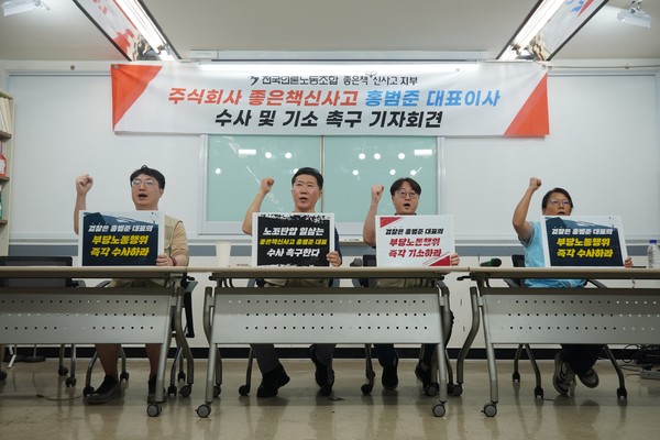 ■ 언론노조 좋은책신사고지부는 24일 오후 2시 언론노조 회의실에서 기자회견을 열고 “검찰은 부당노동행위를 저지른 좋은책신사고 홍범준 대표를 즉각 수사·기소하라”고 촉구했습니다. 고용노동부 서울남부지청은 노조 창립 이래 이어져 온 홍범준 대표의 단체교섭 거부를 부당노동행위로 인정, 검찰에 기소의견으로 송치했지만 서울남부지검은 10개월이 지나도록 홍 대표에 대한 수사와 기소를 하지 않고 있기 때문입니다. 이날 기자회견에서 전대식 언론노조 수석부위원장은 “이 싸움은 좋은책신사고지부 조합원 10여 명의 문제가 아닌 전체 노동자들의 노동권에 영향을 주는 사례가 될 수 있는 만큼 언론노조는 국정감사, 여론전 등 모든 수단을 동원해 홍범준의 노동탄압 행위를 저지할 것”이라며 “홍범준은 헌법에 보장된 노동자들의 권리를 보장하라”고 지적했습니다. 한편, 좋은책신사고지부는 지난 3일 좋은책신사고 사옥 앞에서 단체교섭 및 노조활동 보장을 촉구하는 집회를 열기도 했습니다. 검찰은 홍범준 대표의 부당노동행위 수사에 적극적으로 대응하길 촉구합니다!