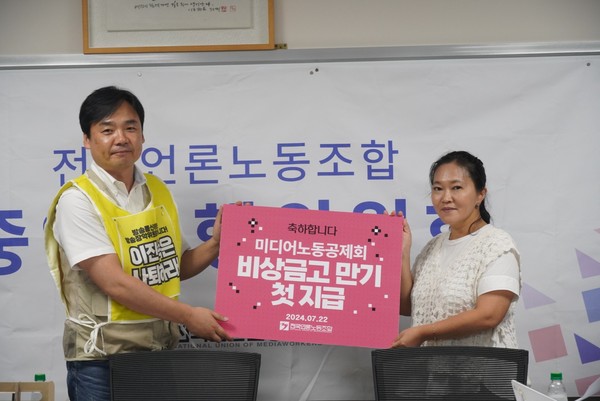 ■ 언론노조에 미디어희망금고 ‘비상금 응원 사업' 가입자 중 첫 만기 수령 회원이 나왔습니다! 언론노조는 7월 22일 중앙집행위원회 시작에 앞서 비상금고 만기 지급금 전달식을 진행했습니다. 이날 전달식에 대표로 나온 염정열 방송작가지부장은 “방송작가들은 파리 올림픽 기간 동안 결방으로 인해 일하고도 돈을 받지 못하게 된다"며 “비상금고 만기 첫 지급이 작가들에게 조금이나마 도움이 되지 않을까 생각한다"고 말했습니다. 언론노조는 2022년 노조 밖에 있는 미디어비정규 노동자를 위한 미디어노동공제회와 미디어연대지부를 출범한 데 이어, 2023년 7월부터 ’소액신용대출사업’, ‘비상금 마련 응원사업’을 본격 시행한 바 있습니다. ‘비상금고 마련 응원 사업’은 가입자가 80만원을 적립하면, 미디어공제회에서 응원금 20만원을 더해 100만원을 지급하는 사업입니다. 미디어공제회는 미디어노동공제회는 미디어산업 내 기간제·파견·용역·도급·프리랜서 노동자들을 대상으로 하며, 언론노조 미디어연대지부에 가입하는 것과 동시에 가입이 이뤄지니 많은 관심 부탁드리겠습니다!
