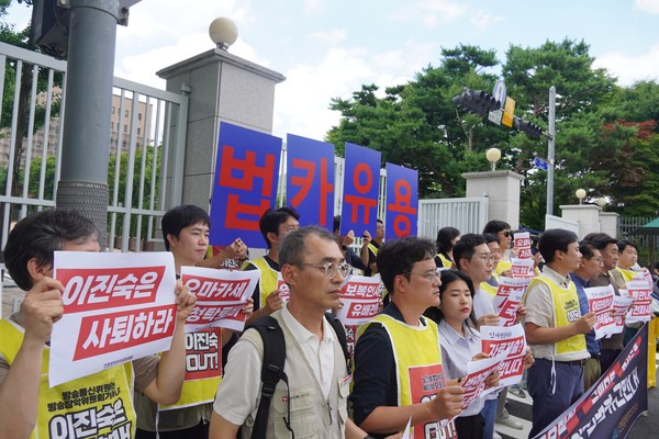 ■ 31일, 윤석열 대통령은 숱한 부적격 사유와 국민의 반대에도 무릅쓰고 이진숙 방송통신위원장 임명을 강행했습니다. 이날 언론장악저지공동행동은 서울중앙지검에 이진숙 방통위원장의 법카 유용 의혹을 고발한 뒤, 방송통신위원회 앞을 찾아 이진숙 방통위원장 임명 규탄 기자회견을 열었습니다. 이날 기자회견에서 윤창현 언론노조 위원장은 “세월호 혐오보도, 이태원 참사 유족 폄훼 등 국민에 대한 혐오와 적대감을 드러낸 이진숙 씨는 최고위공직자는 커녕 평균적인 국민의식에도 못미치는 사람"이라며 “이진숙이라는 사회적 흉기를 공직자에 임명한 것은 윤석열 정권의 명을 재촉하는 시한폭탄"이라고 비판했습니다.