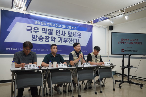 ■ 언론노조는 6일 오전 10시 30분 언론노조 회의실에서 기자회견을 열고 위법적 2인 체제 방통위가 선임한 극우, 막말 공영방송 이사진들의 면면을 밝히고 규탄했습니다. 이진숙 방송통신위원장과 김태규 부위원장은 지난 7월 31일 출근 반나절 만에 KBS 이사 7명과 MBC 대주주인 방송문화진흥회(방문진) 이사 6명을 임명한 바 있습니다. 당시 83명에 달하는 공영방송 이사 공모 지원자들을 약 2시간 만에 심사해 한 사람당 심사시간이 40초에 불과한 ‘졸속 날림 심사’라는 비판이 일었습니다. 대표적으로 방문진 이사로 선임된 임무영 씨는 변호사 시절 이진숙 방통위원장의 사건 대리인으로 이해충돌 논란을 빚고 있으며, 마찬가지로 방문진 이사에 선임된 이우용 씨는 MBC 라디오본부장 시절 김미화, 김종배 등 방송 진행자 퇴출에 앞장선 인물입니다. 현재 법원은 이진숙 방통위원장의 공영방송 이사 임명 효력 정지 가처분 신청을 인용해, 이들의 임기 시작엔 제동이 걸린 상황입니다.