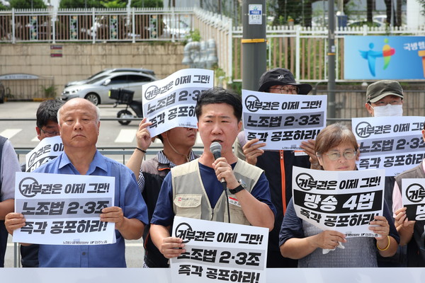 ■ 6일, 민주노총과 노조법 2·3조 개정 운동본부는 용산 대통령실 앞에서 노조법 2·3조 및 방송4법 즉각 공포 촉구, 대통령 거부권 행사 반대 기자회견을 열었습니다. 윤석열 정부는 방송4법에 대해 대통령의 임명권을 침해하는 반헌법적 법안이라고 규정했습니다. 이에 대해 이날 기자회견에서 전대식 언론노조 수석부위원장은 “정권은 공영방송 사장이 바뀔 때마다 전리품 챙기듯이 자신들에게 유리한 이사를 선임하고 사장을 임명해왔다"며 “국민의힘이 야당일 때는 그렇게 바꾸자고 했던 법을 여당이 되니 편향성 문제를 삼으며 법을 거부하고 있다”고 지적했습니다.