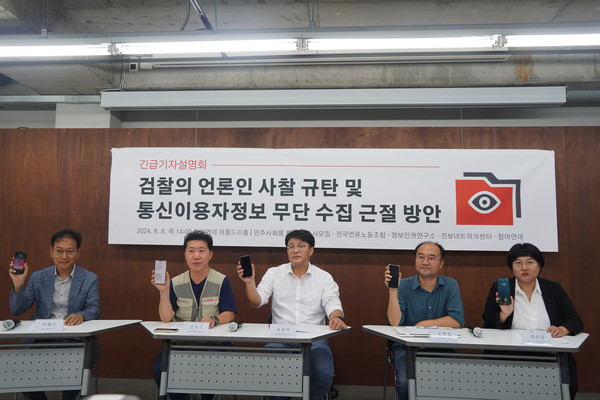 ■ 8일 오후 2시 민주사회를 위한 변호사모임, 정보인권연구소, 진보네트워크센터, 참여연대, 전국언론노동조합이 참여연대 아름드리홀에서 <검찰의 언론인 사찰 규탄 및 통신이용자정보 무단 수집 근절 방안> 긴급 기자설명회를 열었습니다. 이날 발언자들은 검찰의 언론인 사찰 사건에 대한 국정조사를 요구하는 한편 수사기관의 통신이용자정보 무단 수집을 근절해야 한다고 한 목소리로 이야기했습니다. 이날 설명회에 참석한 전대식 언론노조 수석부위원장은 “현재까지 파악된 바로는 윤석열 대통령 명예훼손 사건 관련 참고인의 지인과 친척, 언론노조 이외의 산별노조 간부 등 사건과 무관한 사람들의 통신이용자정보가 대거 조회됐다”며 “언론노조는 이 사건을 국가기관의 언론인 사찰로 규정하고 야당과 공조해 정권 언론장악 국정조사를 추진할 방침”이라고 밝혔습니다. 언론노조는 검찰의 언론인 사찰을 강하게 규탄하며 재발 방지를 위해 철저한 조사 및 관련제도 보완입법을 요구합니다.