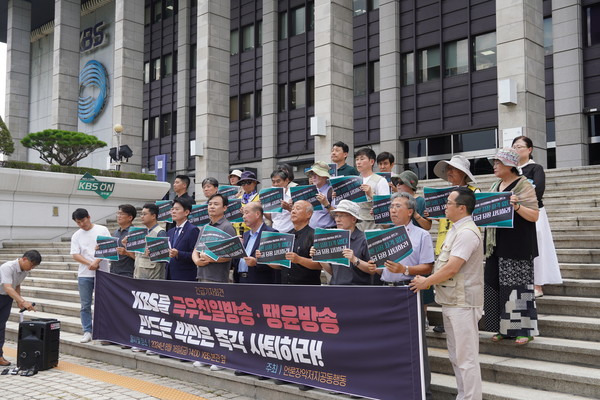 ■ 언론장악저지공동행동은 16일 KBS본관 앞에서 기자회견을 열고 “KBS를 극우·친일방송으로 만드는 박민 사장은 즉각 사퇴하라"고 촉구했습니다. KBS는 광복절 79주년이 되는 날 새벽 오페라 <나비부인>을 방송해 광복절 첫 방송에서 기미가요가 흘러나오는 참변을 일으킨 한편, 방영 취소 청원까지 올라온 이승만 찬양 다큐멘터리를 그대로 방영했습니다. 또 좌우 반전된 태극기가 송출돼 시청자 게시판에 항의글이 쇄도했습니다. 이날 기자회견에 참석한 윤창현 언론노조 위원장은 “이 사태의 뿌리는 박민 KBS 사장 한 사람의 문제가 아니라, 임시정부의 법통과 4.19 혁명의 정신을 전문에 못 박은 헌법을 부정하는 반국가세력이 윤석열 정부 중심에 있는 데서 출발한다"고 비판했습니다.