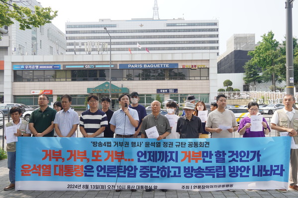 ■ 언론장악저지공동행동은 13일 용산 대통령실 앞을 찾아 윤석열 대통령의 방송4법 거부권 행사를 규탄하는 기자회견을 진행했습니다. 윤석열 대통령은 하루 앞선 12일 국회 본회의를 통과한 방송4법에 거부권을 행사해 공영방송 정치독립이라는 국민의 염원을 다시 한 번 저버렸습니다. 이날 기자회견 참석자들은 “방송4법에 대한 윤석열의 거부권 행사는 민주주의에 대한 심대한 도전이자 헌법정신을 부정하는 행위"라고 비판했습니다. 대통령실은 거부권 행사의 근거로 “방송의 공정성과 공익성을 훼손시키려는 야당의 법안 강행조치에 대한 불가피한 조치"이자 “여야 합의와 사회적 공감대가 이뤄지지 않은 채 정략적으로 처리됐다는 지적을 받고 있다"고 주장했으나 이는 전부 윤석열 정부에게 되돌아갈 말들입니다. 박민 KBS 사장을 선임해 세월호 10주기 다큐멘터리 불방, 광복절 이승만 찬양 다큐 방영 추진을 밀어붙이고 2인 체제 불법 방통위는 YTN을 민영화해 언론장악 부역자 김백을 사장 자리에 앉혔기 때문입니다. 이런 정부는 언론의 공공성, 사회적 공감대를 운운할 자격이 없습니다. 언론노조는 앞으로도 정권의 언론장악을 저지하기 위한 투쟁을 이어가겠습니다.
