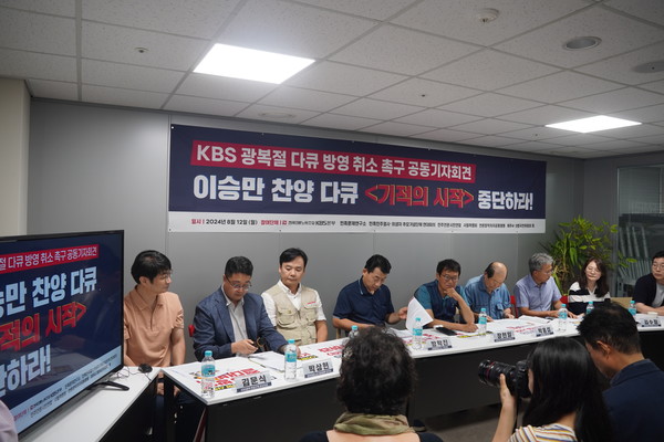 ■ 언론장악저지공동행동은 12일 기자회견을 열고 KBS 사측에 광복절 당일 이승만 전 대통령을 미화하는 다큐멘터리 방영을 취소하라고 촉구했습니다. 앞서 KBS가 광복절 당일 방영하기로 결정한 다큐멘터리는 <기적의 시작>입니다. <기적의 시작>은 이승만 전 대통령에 대해 친일파, 독재자란 평가 없이 ‘건국의 아버지'로 규정하는 한편 4.19 혁명, 제주 4.3, 여순사건 등 국가적으로 정립된 역사를 부정하면서도 학술적 논증은 제시하지 않았습니다. 영화진흥위원회(영진위)가 “객관성이 결여돼 기준에 못 미친다"며 ‘독립영화'로 인정하지 않은 이유입니다. 이날 기자회견에 참석한 윤창현 언론노조 위원장은 “‘기적의 시작' 같은 역사왜곡 포르노를 공영방송에서 방영한다는 건 박민 KBS 사장 체제가 주도해 ‘방송 사고'를 내겠다는 의미"라고 비판했습니다.