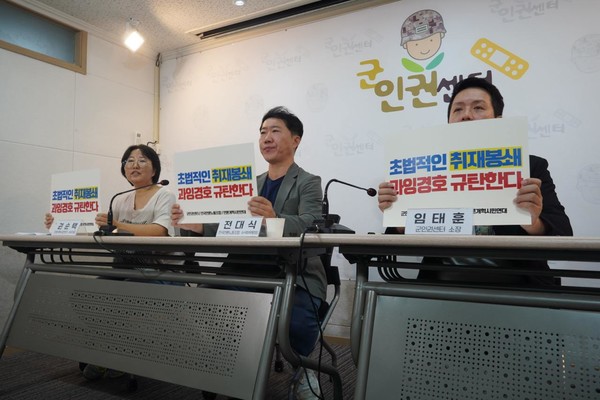 ■ 지난 5일, 군인권센터는 시민들에게 받은 임성근 전 해병대 1사단장 명예전역 반대 서명을 제출하기 위해 국방부 민원실을 방문하고자 했습니다. 그동안 민원실에서 여러 차례 취재가 이뤄졌음에도 대통령경호처와 경찰은 민원실로 향하는 삼각지역 횡단보도에 바리케이드를 치며 기자들의 민원실 취재를 이례적으로 전면 통제했습니다. 이에 군인권센터, 전국언론노동조합, 언론개혁시민연대는 22일 군인권센터에서 대통령실·국방부 취재 원천 봉쇄 규탄 및 국가인권위 진정 기자회견을 열고 국민의 알권리를 침해한 대통령실과 국방부에 강한 유감을 표했습니다. 이날 기자회견에서 전대식 언론노조 수석부위원장은 “입틀막 사건에 이어 횡틀막 사건이 발생했다"며 “취재는 국민의 알권리와 권력 감시를 위한 기자의 임무이며 좌우가 없다”고 강조했습니다. 세 단체는 기자회견문을 통해 “윤석열 정권은 대통령 경호를 핑계로 ‘취재할 수 없는 것’을 규정하고 사실상의 검열을 자행하며, 자유로운 이동을 법률상 아무런 근거도 없이 광범위하게 통제했다”며 “이러한 전례를 그대로 남겨둔다면 향후 대통령과 그 부속기관이 경호를 핑계삼아 각종 언론을 검열하고 취재를 통제하는 일은 비일비재하게 벌어질 것”이라고 비판하며 국가인권위에 진정을 제기한 사유를 밝혔습니다.