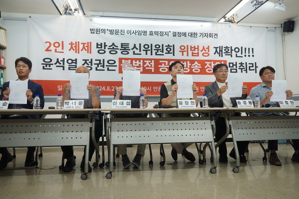 ■ 이진숙 방송통신위원장의 위법한 방문진 이사 선임 시도에 제동이 걸렸습니다. 법원이 방문진 이사 임명처분 집행정지 신청을 받아들인 것입니다. 2인 체제의 방통위에서 이뤄진 의결, 심의는 방통위법의 입법 목적을 저해하며, 이진숙 방통위원장이 7월 31일 졸속으로 의결한 공영방송 이사 선임엔 절차적 하자가 있다는 이유입니다. 언론장악저지공동행동은 27일 기자회견을 열고 법원의 결정에 환영의 뜻을 밝혔습니다. 이날 기자회견에 참석한 윤창현 언론노조 위원장은 “윤석열 정권의 언론장악 난동은 번번이 법원에 의해 가로막혔고 앞으로도 그럴 것"이라며 “언론자유를 보장하고 공영방송의 정치적 독립을 보장하는 법률 개정에 나서는 것만이 이 사태의 완전한 해법"이라고 말했습니다.