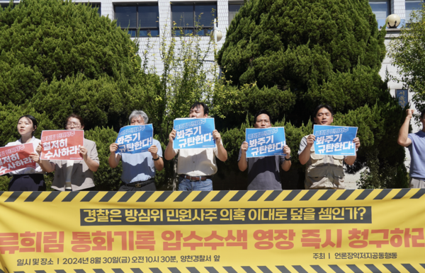 ■ 언론노조는 30일 양천경찰서 앞에서 기자회견을 열고 류희림 방심위원장의 민원사주 의혹을 철저히 수사하기 위해 통화기록 압수수색 영장을 청구하라고 촉구했습니다. 지난해 류희림 방심위원장의 가족, 지인 동원 민원사주 사건이 알려졌고, 문화연대, 민주언론시민연합, 새언론포럼, 언론노조 등 4개 단체는 작년 11월 류희림 방심위원장을 직권남용으로 고발했습니다. 하지만 수사를 담당한 양천경찰서는 7개월 동안 고발 내용의 진위를 판단하기 위한 통신기록 확보나 통신조회 등의 수사에 일절 나서지 않고 있습니다. 정권의 눈치를 보느라 통화기록 조회가 불가능해지는 1년이 경과하길 기다리는 게 아니냐는 말까지 나온 이유입니다. 이날 기자회견에 참석한 윤창현 언론노조 위원장은 “경찰은 제보를 사주받았다며 방심위 직원들과 의혹을 보도한 기자들을 거꾸로 수사 대상에 올리고 통신기록을 털고 있다"며 “부실수사에 대해 반드시 책임을 물을 것"이라고 비판했습니다.