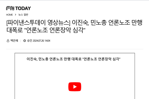 같은 날 보도된 <[파이낸스투데이 영상 뉴스] 이진숙, 민노총 언론노조 만행 대폭로 “언론노조 언론 장악 심각”>은 조정이 이뤄지지 않았다. 불성립한 것. “민주노총 조합원이 압도적으로 MBC를 좌지우지, 힘에 의한 지배를 하고” 있고 “민노총 언론노조가, 노조의 지배 계층, 상층부가 사실상 후배들을 좌지우지한다”는 이진숙 발언을 끌어 썼되 기사 제목을 <언론노조 만행 대폭로 “언론노조 언론 장악 심각”>으로 편집해 악의를 품었다.