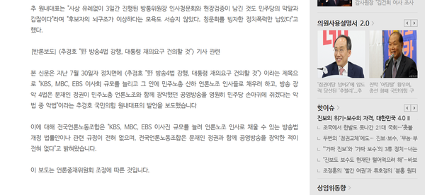 2024년 7월 30일 <추경호, 野 방송4법 강행, 대통령 재의 요구 건의할 것”>이라는 제목으로 “KBS, MBC, EBS 이사회 규모를 늘리고 그 안에 민주노총 언론노조 인사들로 채워 공영방송 이사회를 더불어민주당 마음대로 구성하겠다는 검은 속내를 국민은 다 알고 있고, 방송 장악 4법은 문재인 정권이 민주노총 언론노조와 함께 장악했던 공영방송을 영원히 민주당 손아귀에 쥐겠다는 악법 중 악법”이라는 추경호 발언을 알린 머니투데이는 정정에 버금갈 반론 보도를 냈다.