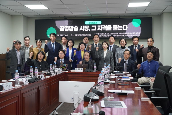 ■ 언론노조는 12일, 국회의원회관에서 국회 더불어민주당 최민희·김우영·김현·노종면·박민규·이정헌·이훈기·정동영·조인철·한민수·황정아 의원과 조국혁신당 이해민 의원과 공동주최로 <공영방송 사장, 그 자격을 묻는다> 토론회를 개최하고 박장범 후보 개인의 자질을 넘어 공영방송 KBS의 수장이 될 자격이 있는가를 따져묻는 자리를 가졌습니다. 이날 토론회에서 발표를 맡은 이준형 언론노조 정책전문위원은 “박장범 후보자는 사장으로서 내외부 이해관계 세력의 편성 및 제작 개입 차단, 제작진 자율성 존중, 불공정한 방송과 부적절한 진행자 조치 등을 하겠다고 약속하였으나 공영방송의 독립성과 공정성이 극심하게 침해됐던 박민 전 KBS 사장 체제에 대한 비판적 평가는 전무하다”고 꼬집었습니다. 이어, 토론자로 나선 박상현 언론노조 KBS본부장은 “진정으로 KBS 사장이 되어야 할 사람은 KBS 내부 구성원들과 시청자들에 대한 신뢰의 위기를 해소할 수 있어야 한다. 그러나 KBS를 향한 시청자들의 신뢰는 박장범 후보의 ‘조그마한 파우치’발언으로 결정됐다. 신뢰의 위기를 자초한 사람은 박장범 후보”라고 강조했습니다.
