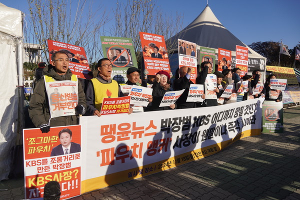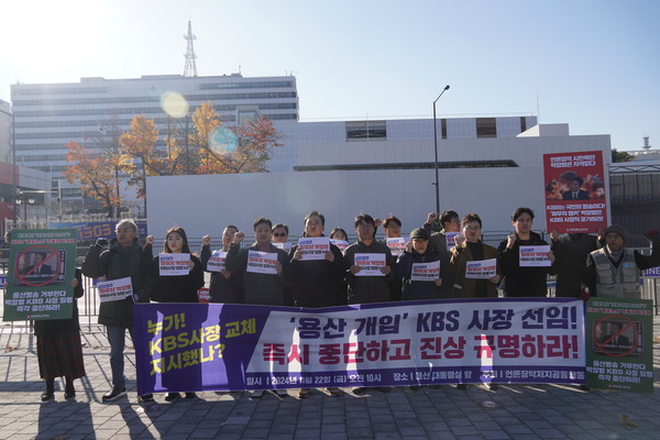 ■ 박장범 KBS 사장 후보자 국회 인사청문회가 열린 11월 18일 언론장악저지공동행동은 국회 앞에서 기자회견을 열고 박장범 사장 후보자의 사퇴를 촉구했습니다. 박장범 KBS 사장 후보는 윤석열 대통령 특별대담에서 김건희 여사가 수수한 명품가방을 ‘조그마한 파우치’로 축소하며 KBS 보도를 ‘땡윤뉴스’로 만든 주범입니다. 이 때문에 KBS 보도본부 내에 최고참부터 막내 기자까지 전국 KBS 기자 495명이 실명으로 반대 성명을 발표하기도 했습니다. 이날 기자회견에 참석한 윤창현 언론노조 위원장은 “박장범이 경영하는 KBS의 모든 프로그램들은 그 진의와 상관없이 ‘윤석열 김건희 부부를 위한 것’으로 평가받을 수밖에 없는 지경이기에 KBS 모든 구성원들이 반대하는 것”이라며 “박장범 사장 후보자는 법원이 잇따라 불법성을 지적하는 2인 체제 방통위가 임명 강행한 7명의 부적격 이사들에 의해 시민 평가도 없이 사장 후보로 선임된 만큼 절차적 정당성마저 상실한 인물”이라고 지적했습니다. 이 같은 언론계와 시민사회의 반발에도 불구하고 윤석열 대통령은 23일 박장범을 KBS 신임 사장으로 임명 강행했습니다. 언론노조는 정권의 언론장악에 맞서 끝까지 싸우겠습니다.