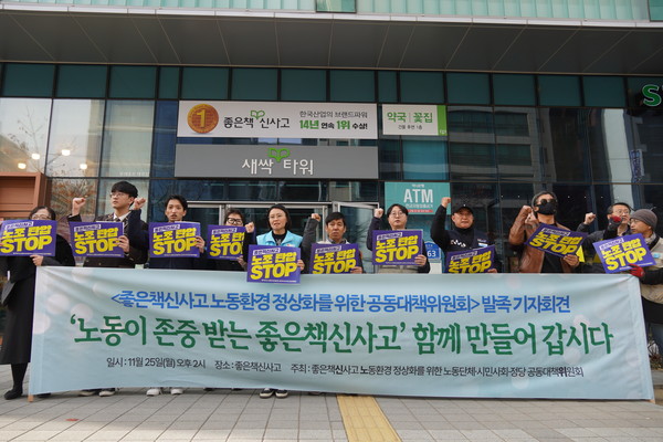 ■ 11월 25일 좋은책신사고 노동환경 정상화를 위한 노동단체, 시민사회단체, 정당 공동대책위원회(약칭 신노위)가 출범했습니다. 신노위 참여 단체들은 노조를 부정하는 홍범준 좋은책신사고 대표이사의 부당노동행위에 맞서 언론노조 좋은책신사고지부와 연대해 투쟁해왔습니다. 최근 대법원은 홍범준 대표에게 노조와의 단체교섭에 성실히 임하라는 판결을 내리기도 했는데요, 그간 홍 대표의 노조 탄압 등 행보를 볼 때 진정성 있는 협상이 가능할지 의문이 드는 상황입니다. 이날 신노위 출범 기자회견에서 정철훈 언론노조 좋은책신사고지부장은 “지난 2년 동안 정말 많은 일이 있었고 아무 일도 없었다. 좋은책신사고지부를 설립하고 수차례 단체교섭을 요구하고 대화를 시도했지만 사측과 단 한 번도 대화할 수 없었다”며 “좋은책신사고가 마음 놓고 일할 수 있는 노동환경을 갖출 수 있도록 신노위가 함께 싸워주시길 부탁드린다”고 말했습니다.