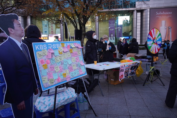 ■ 11월 28일 언론장악저지공동행동은 광화문역 6번 출구 앞에서 용산 낙하산 박장범 KBS 사장 임명을 규탄하며 퇴근길 버스킹을 진행했습니다. 이날 버스킹에선 룰렛을 돌려 시민분들께 ‘조그마한 파우치’를 나눠드렸고, 브로콜리너마저 덕원님의 공연도 함께 열렸습니다. 추운 날에도 많은 시민분들이 참석해 ‘파우치 앵커’ 박장범은 KBS 사장으로서의 자격이 없다고 외쳐주셨습니다! 모두모두 감사드립니다!