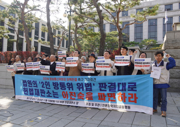 ■ 12일, 헌법재판소에서는 방송통신위원회 2인 체제로 공영방송 이사회를 임명한 이진숙 방송통신위원장에 대한 탄핵소추 1차 심리가 열렸습니다. 언론노조가 함께 활동하고 있는 언론장악저지공동행동은 이날 헌법재판소 앞에서 이진숙 방송통신위원장 탄핵 판결을 촉구하는 기자회견을 열고, 방송장악과 언론탄압에 앞장선 이진숙 방송통신위원장은 파면되는 것이 마땅하다고 강조했습니다. 기자회견에서 윤창현 언론노조 위원장은 “이진숙과 또 다른 대통령 추천 방통위원인 현행 김태규 직무대행은 둘이서 공영방송 MBC 대주주 방문진 이사 선임 KBS 이사 선임 작업을 강행했다. 초등학생도 아는 정족수의 기본 원리조차 무시하고 방통위의 의결 절차를 진행한 것”이라며 “내용적으로도 불법 투성이다. 80여 명에 달하는 공영방송 이사 공모 지원자들의 평균 심사 시간은 1분도 되지 않는다”고 밝혔습니다. 언론장악저지공동행동은 기자회견문을 통해 “이진숙은 '임명 당일'에 김태규 상임위원과 단 둘이 공영방송 임원 선임을 전광석화로 의결하는 등 중대한 법률위반 행위를 벌여 8월 2일 국회로부터 탄핵소추를 당했다”며 “합의제 기구인 방통위에서 2인만으로 중대 사안 의결을 강행한 것은 민주주의를 심각하게 파괴한 ‘행정독주’”라고 지적했습니다. 이진숙 방송통신위원장에 대해서는 “방송장악 전력, 노조탄압, 법인카드 유용, 극우편향 인식, 참사 희생자에 대한 혐오와 막말 등 수많은 결격사유로 방통위원장은커녕 건강한 시민의 일원으로도 낙제점”이었음을 밝히며 “그런데도 윤석열은 이진숙 방통위원장 임명을 강행했고, 결국 국회에서 이틀만에 탄핵 소추되었다”고 비판했습니다.