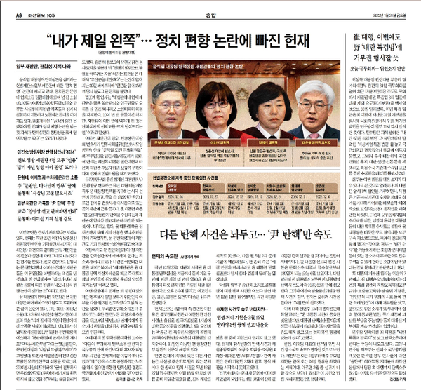 같은 날 1면으로부터 8면에 이어 쓴 <다른 탄핵 사건은 놔두고··· ‘尹 탄핵’만 속도>를 헌재 ‘정치 편향 논란’ 보도 아래에 붙여 편집한 것도 매한가지. 윤석열 탄핵 심판과 한덕수(총리)·박성재(법무부장관)·조지호(경찰청장)·최재해(감사원장)·이창수(서울중앙지검장) 탄핵 재판 속도에 ‘형평’을 견준 나머지 내란 옹호 편파로 읽혔다.