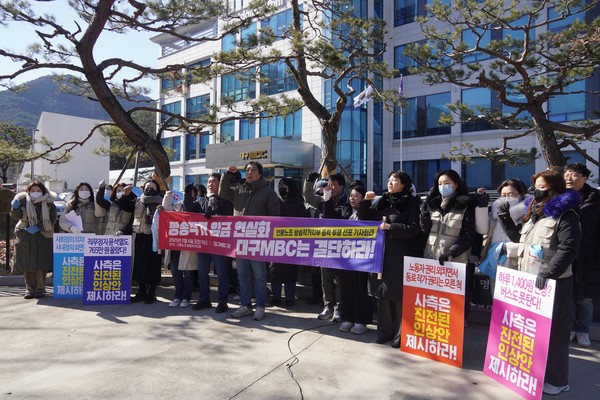 ■ 4일 언론노조 방송작가지부는 대구MBC 사측에 방송작가 임금 현실화를 요구하며 총력 투쟁 기자회견을 열었습니다. 대구MBC와 대구MBC 소속 방송작가지부 조합원들은 지난해 6월부터 올해 1월까지 6차례 실무교섭을 이어왔습니다. 조합원들은 임금 10.3% 인상을 요구했으나 사측은 ▲라디오 작가 임금 2% 인상 ▲TV 작가 임금 4% 인상을 제시하는 데 그쳤고, 조합원들이 대안을 제시했음에도 묵묵부답으로 일관해 교섭은 답보 상태에 빠졌습니다. 언론노조 방송작가지부는 “방송작가들은 방송 제작의 중추 역할을 하지만 방송사가 어려우면 고통 분담을 이유로 원고료를 깎이는 등 제대로 된 임금은 받지 못한다”며 “대구MBC 사측이 진전된 임금 인상안을 내놓지 않을 경우, 정당한 권리를 찾기 위해 단체투쟁과 쟁의조정 신청 등을 적극 검토할 것”이라고 밝혔습니다.