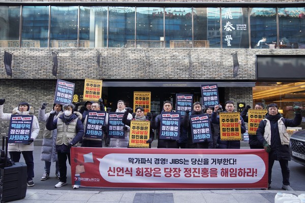 ■ 언론노조 JIBS제주방송지부는 6일 서울 명동에 있는 JIBS제주방송 대주주 (주)한주홀딩스코리아 본사 사무실 앞에서 정진홍 사장 해임을 요구하는 피켓 시위를 진행했습니다. 지부는 2022년 임금·단체협약 교섭을 3년간 22차례 했으나, 사측이 경영악화를 핑계로 임금 동결을 주장해 지난해 교섭이 결렬됐습니다. 하지만 창립 당시 140억 원이던 자본금은 현재 400억 원으로 증가했고 보유 부동산 지가가 7배 이상 오르는 등 회사 재정 여건은 크게 좋아졌습니다. 이에 지부는 지난해 10월 28~29일 총파업을 결의한 바 있습니다. 이 같은 상황에서 지난 1월 13일 취임한 정진홍 대표이사는 막말과 폭언, 직장 내 갑질, 단협 위반 등의 행태를 이어왔습니다. 이날 부현일 JIBS제주방송지부장은 “작년 말 신언식 회장은 노조가 요구하는 혁신을 바로 세우고 조속한 임단협 체결에 나서겠다고 했지만 쟁의 돌입 100일이 지난 오늘까지 한 차례도 교섭이 이뤄지지 않았다”며 “노조 집행부와의 간담회 자리에서 삿대질, 욕설, 막말을 일삼는 정진홍 사장은 JIBS제주방송에서 떠나야한다”고 강조했습니다.