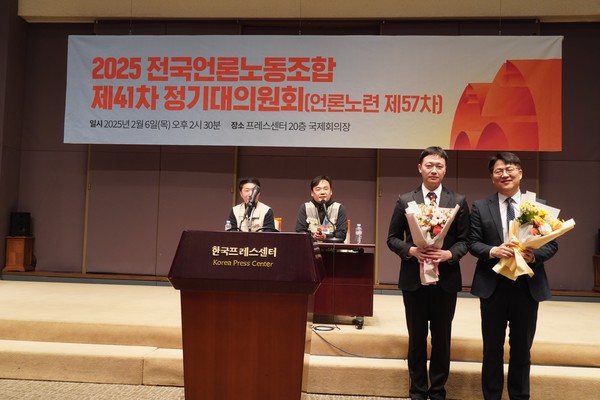 ■ 언론노조는 6일 제41차 정기대의원회를 열고 언론노조 제13대 임원 선거를 진행했습니다. 이날 선거에서 기호1번 이호찬(MBC본부)-조성은(국민일보지부) 후보조가 116표, 기호2번 김현태(연합뉴스지부)-최지호(울산MBC지부) 후보조가 60표를 얻어 기호1번 후보조가 최종 당선되었습니다. 제13대 임원의 임기는 오는 3월 1일부터 시작됩니다. 한편 이번 정기대의원회에서는 위원장・수석부위원장 선출 안건과 함께 ▲민주노총 파견대의원 선출 건 ▲2024년 활동보고・평가 및 결산・회계감사 보고 승인 건 ▲2025년 사업계획 및 예산 승인 건▲13대(연맹19대) 회계감사 등 임원 선출 건 등이 함께 상정돼 가결됐습니다.