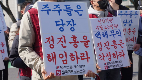 이날 결의대회에 참석한 이호찬 언론노조 위원장은 “정진홍 사장은 노사 간의 기본적 자치규범인 단체협약을 무시하는 것도 모자라 노동조합 대표자에게 폭행과 욕설과 막말을 쏟아냈다“며 ”이런 자에게 지역 민주주의 발전에 기여해야할 공적 책무를 지닌 지상파 방송사의 경영을 맡길 수 없는 만큼 즉각 해임해야 한다“고 비판했다.