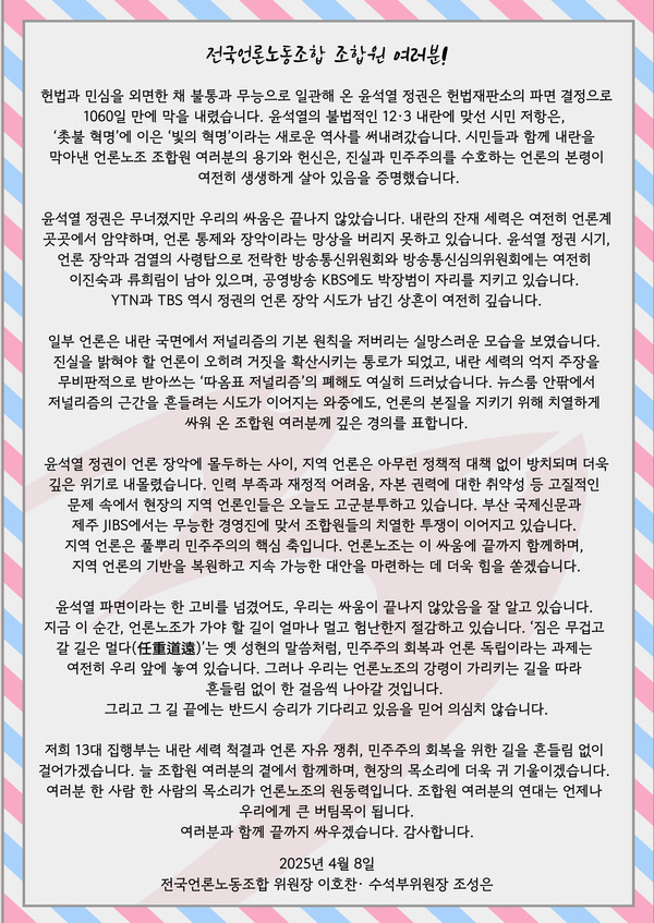 저희 13대 집행부는 내란 세력 척결과 언론 자유 쟁취, 민주주의 회복을 위한 길을 흔들림 없이 걸어가겠습니다. 늘 조합원 여러분의 곁에서 함께하며, 현장의 목소리에 더욱 귀 기울이겠습니다. 여러분 한 사람 한 사람의 목소리가 언론노조의 원동력입니다. 조합원 여러분의 연대는 언제나 우리에게 큰 버팀목이 됩니다.